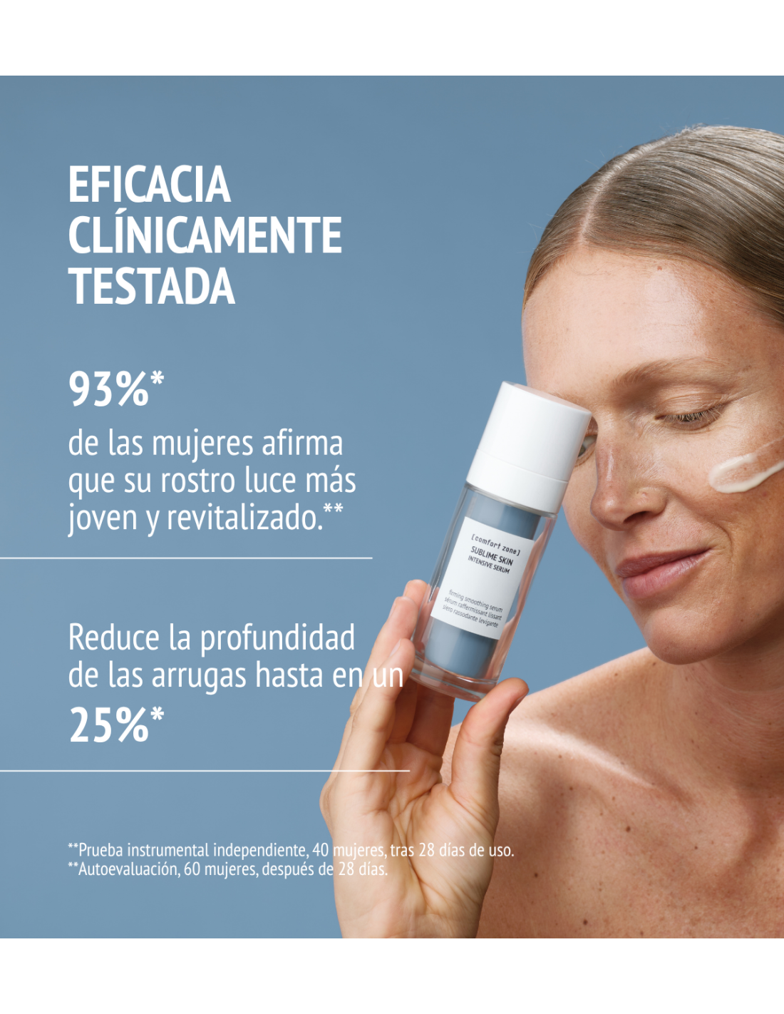 *** tersura y textura: laboratorio independiente, evaluación clínica, 40 mujeres, 28 días de uso. Firmeza: laboratorio independiente, evaluación instrumental, 20 mujeres, 28 días de uso Sérum + Fluid Cream o Sérum + Cream.